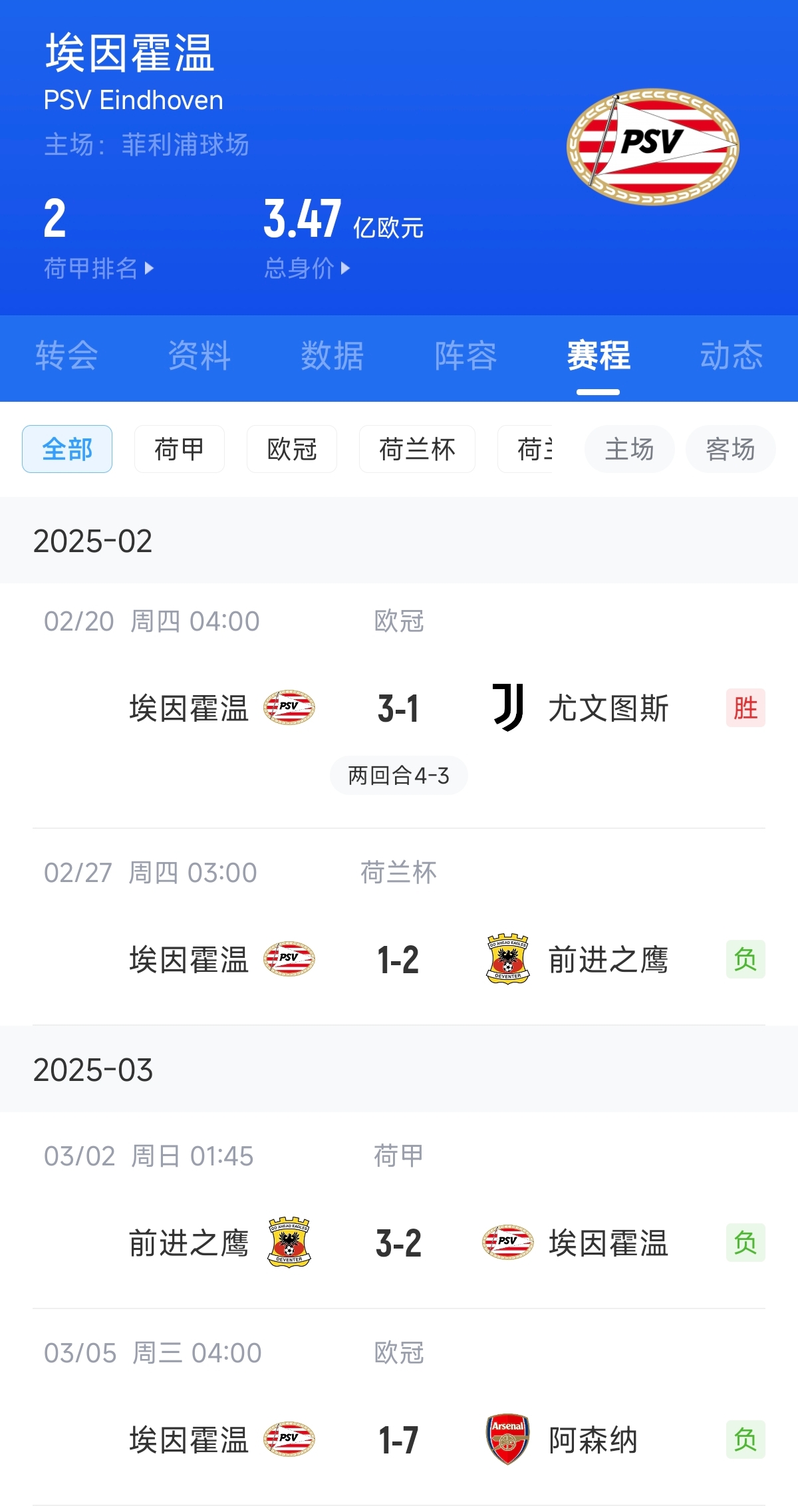 03月05日訊 歐冠16強比賽首回合,埃因霍溫在主場1-7被阿森納擊敗。在歐冠附加賽3-1逆轉尤文之后,埃因霍溫各項賽事3連敗。另一場布魯日則是主場1-3不敵維拉,雙殺亞特蘭大后1平2負1勝難求。
