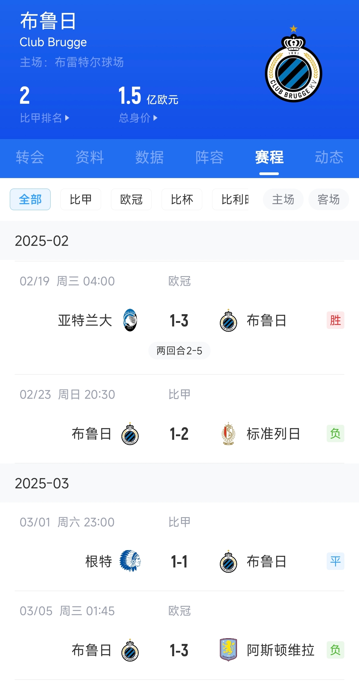 2月23日比甲布魯日1-2不敵標準列日,3月1日比甲布魯日1-1戰(zhàn)平根特,距離榜首亨克9分。3月5日凌晨,布魯日1-3不敵阿斯頓維拉。