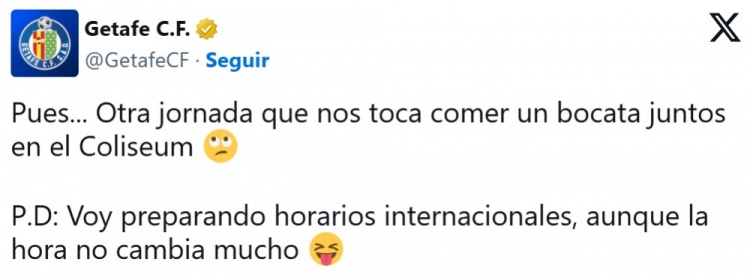 赫塔菲將于本周日下午14:00對陣馬競,而他們下個主場對陣萊加內(nèi)斯的比賽也是在下午14:00進(jìn)行。與此同時,西甲聯(lián)賽宣布了第29輪的賽程,赫塔菲再次在下午14:00主場迎戰(zhàn)比利亞雷亞爾,俱樂部在社交網(wǎng)絡(luò)上調(diào)侃這一賽程。