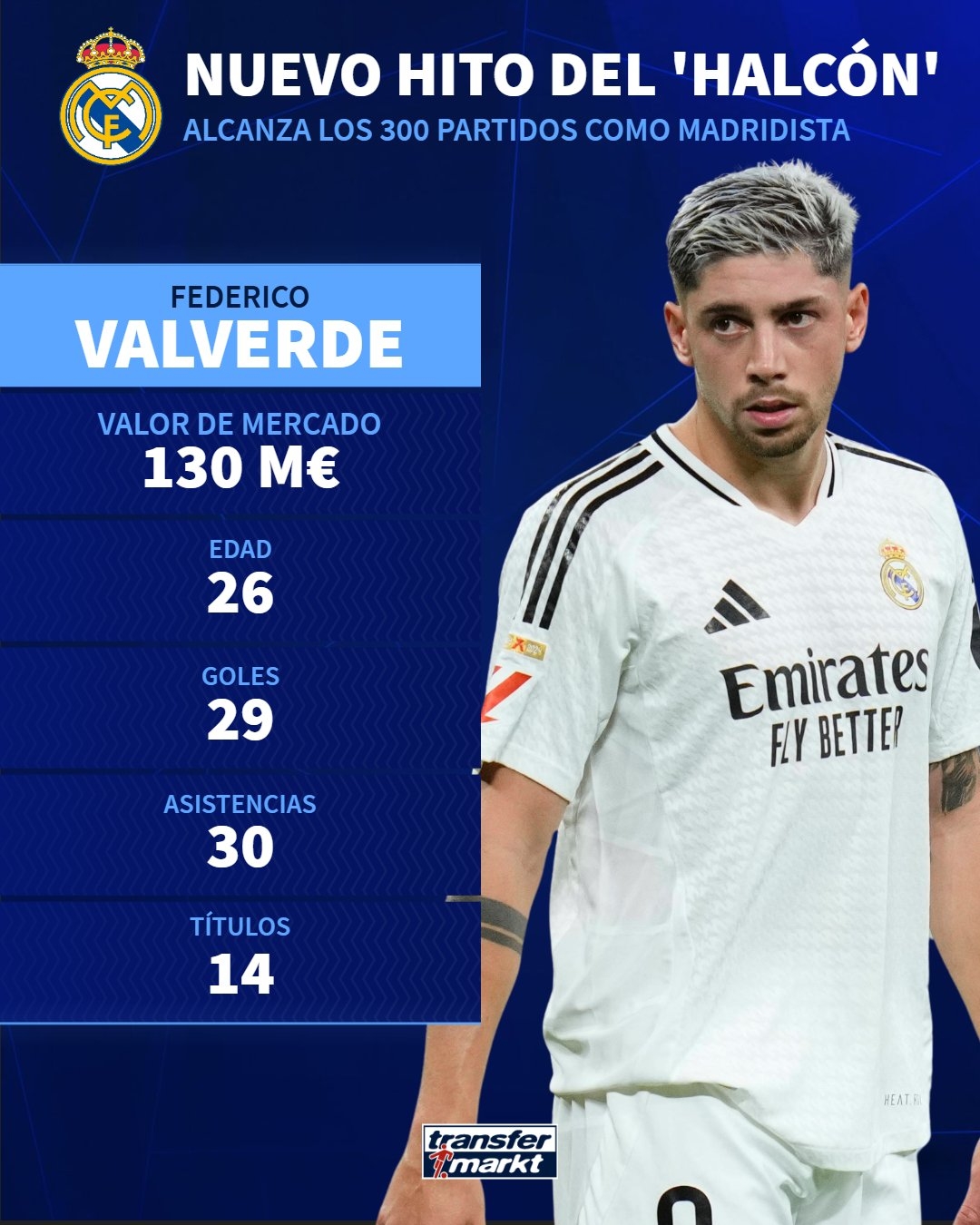 巴爾韋德達(dá)成皇馬生涯300場里程碑,一共取得29球+30助攻,幫助皇馬奪得14座冠軍,包括2座歐冠+3座西甲。