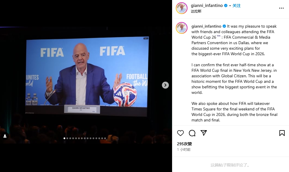 因凡蒂諾在自己的社媒中寫道:我可以確認,在新澤西舉行的2026年世界杯決賽上,將首次推出中場休息演出,F(xiàn)IFA將與Global Citizen合作。這會是FIFA世界杯的一個歷史性時刻。
