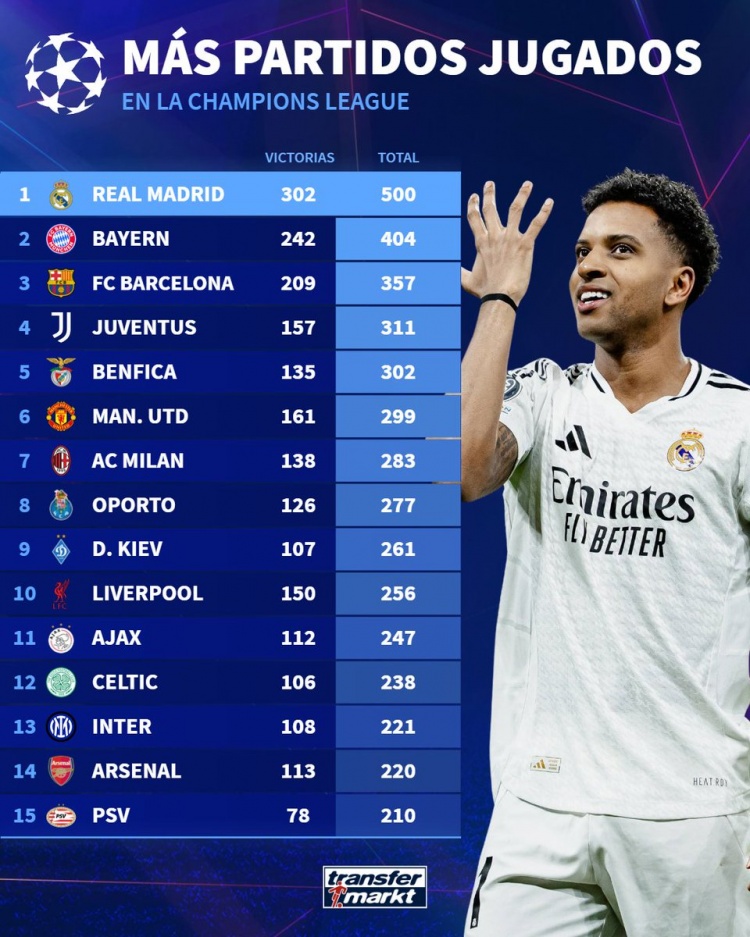 皇馬也是參加歐冠場次最多的球隊,拜仁404場第二,巴薩357場第三。