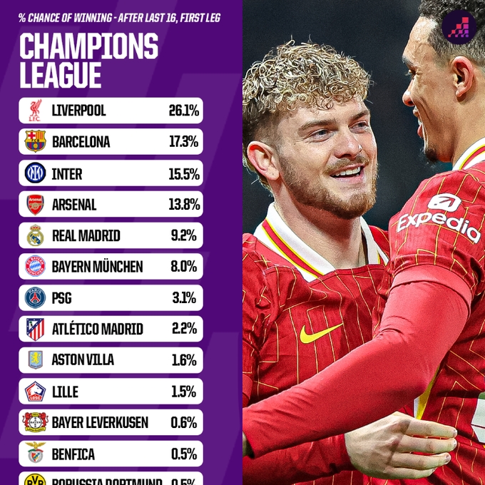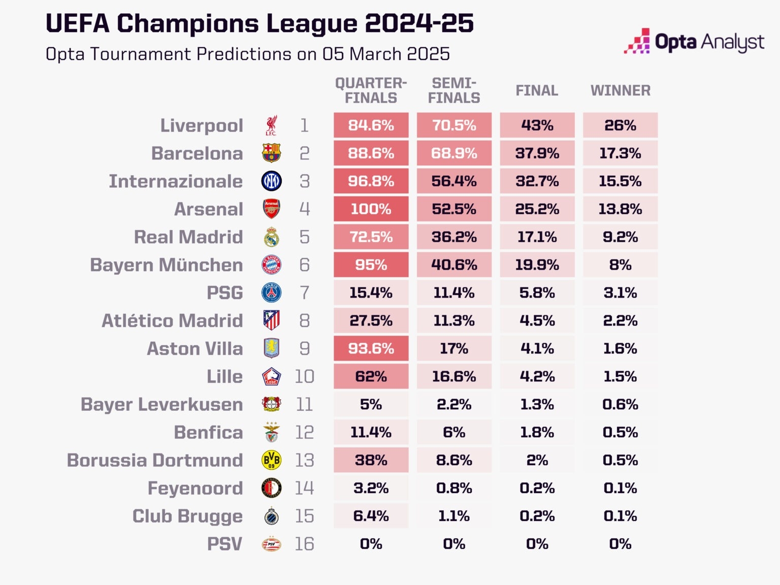 發(fā)布時間:2025年03月06日 07:50點擊:欄目:足球新聞 3月6日訊 歐冠1/8決賽首回合結(jié)束,Opta更新了最新的歐冠晉級概率。其中,大概率晉級歐冠八強的球隊包括:利物浦、巴薩、國米、阿森納、皇馬、拜仁、維拉、里爾。此外,Opta還計算了各支球隊晉級歐冠四強、決賽以及歐冠奪冠的概率。 除特別注明外,本站所有內(nèi)容均為九球直播整理排版,轉(zhuǎn)載請注明出處:Opta歐冠晉級概率:利物浦、巴薩有望會師決賽 國米、槍手劍指4強 本文標(biāo)簽: 英超 阿森納 利物浦 西甲 巴塞羅那 意甲 國際米蘭 足球