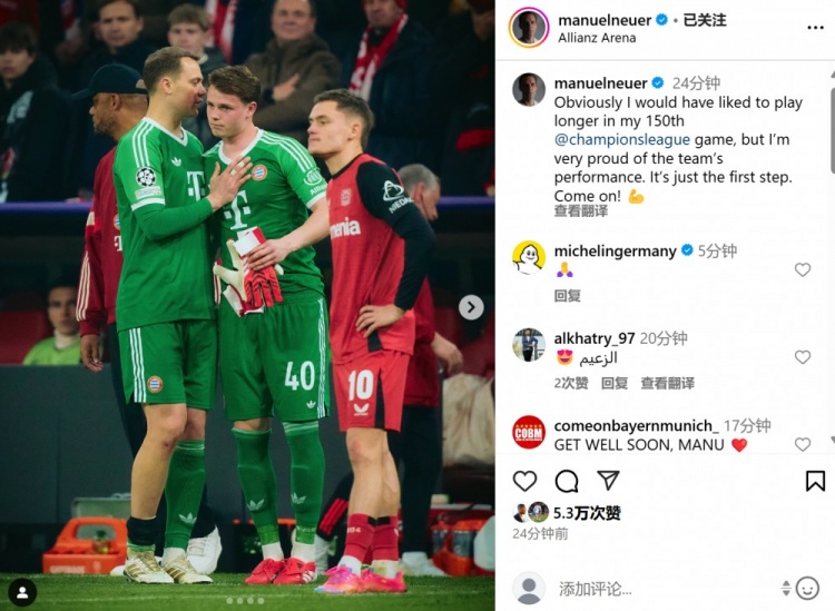 本場比賽是諾伊爾生涯第150次歐冠出場,不過他在比賽中因傷被換下。賽后他在個人社媒曬出被烏爾比希換下照片,配文道:“顯然我希望在自己第150場歐冠踢更長時間,但是我為球隊的表現(xiàn)感到驕傲,這只是晉級的第一步,加油!”
