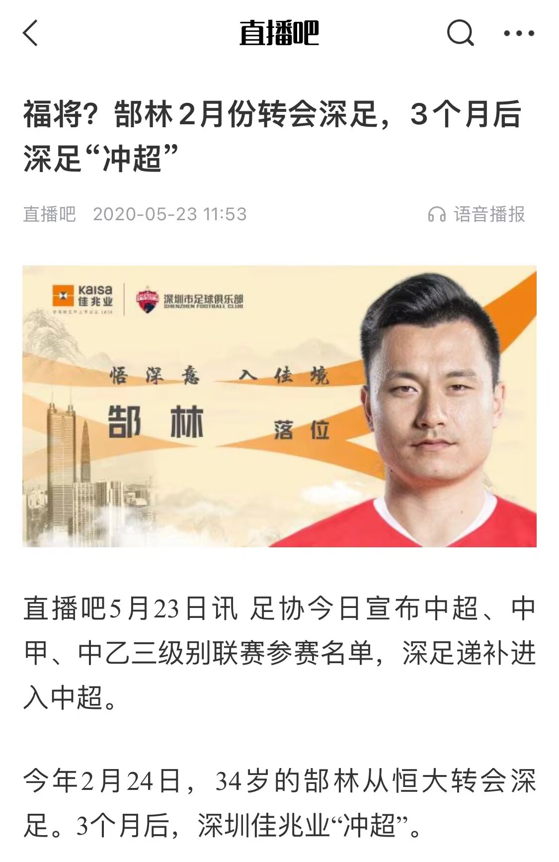 2020年2月,34歲的郜林轉(zhuǎn)投中甲深圳佳兆業(yè),拿到國(guó)內(nèi)球員頂薪1000萬(wàn),國(guó)腳可增幅20%,達(dá)到1200萬(wàn)元人民幣。3個(gè)月后,深足遞補(bǔ)進(jìn)入中超,郜林“無縫銜接”繼續(xù)踢中超。