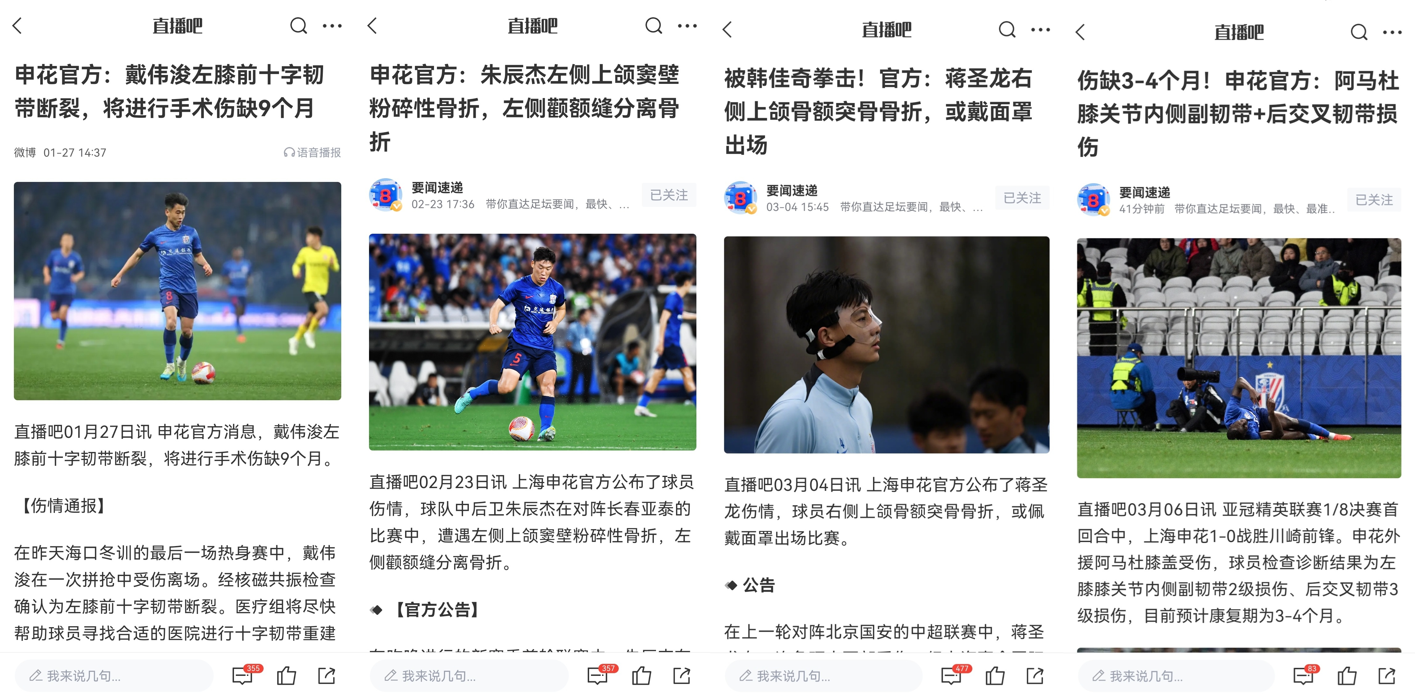 發(fā)布時(shí)間:2025年03月06日 22:50點(diǎn)擊:欄目:足球新聞 除特別注明外,本站所有內(nèi)容均為九球直播整理排版,轉(zhuǎn)載請(qǐng)注明出處:要不要去拜拜中超開賽不到兩周,申花2人嚴(yán)重膝傷2人面部骨折 本文標(biāo)簽: 足球 中超 中國足球 上海申花