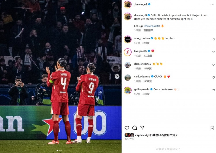 賽后努涅斯在個(gè)人社媒曬出與范迪克謝場(chǎng)照片,配文寫(xiě)道:“艱難的比賽,重要的勝利,但是工作還沒(méi)有完成,主場(chǎng)還有90分鐘比賽需要拼搏。”