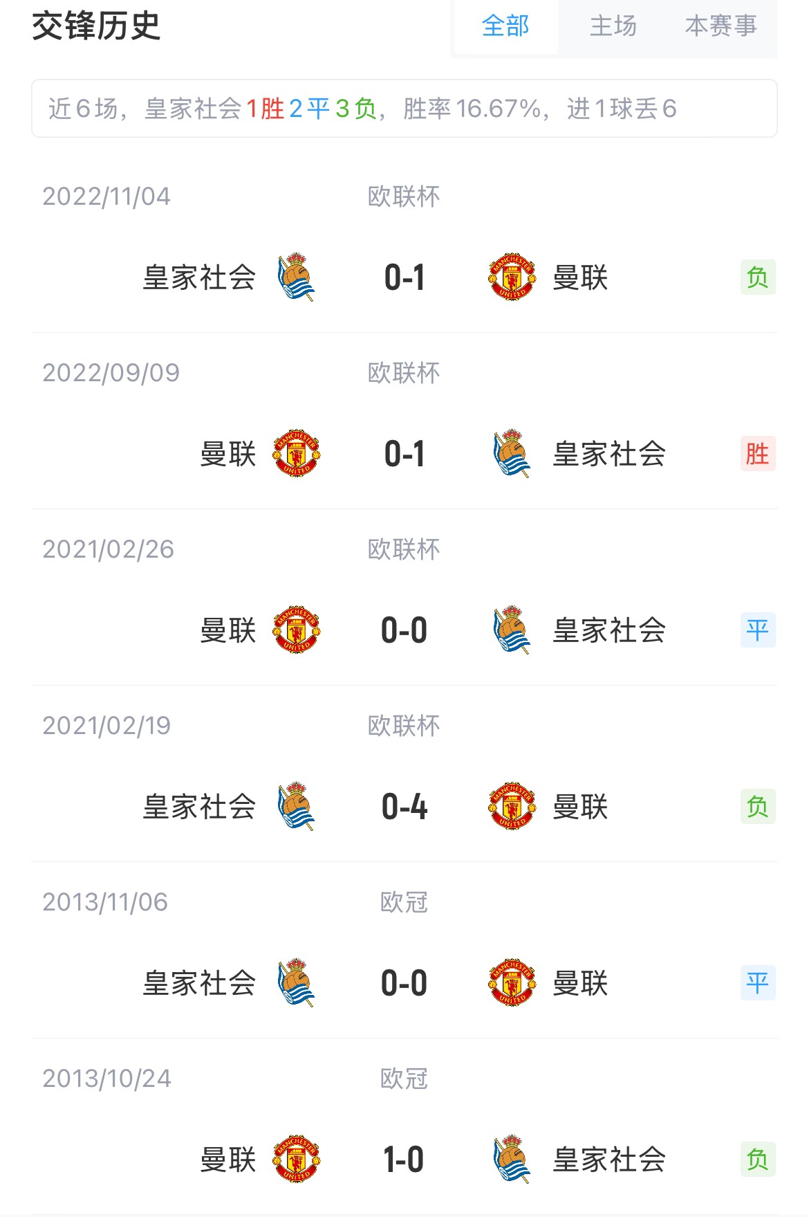 曼聯(lián)與皇家社會共交手過6次,曼聯(lián)3勝2平1負(fù)。此外,本賽季歐聯(lián)杯,曼聯(lián)目前是唯一一支不敗球隊(duì),他們聯(lián)賽階段5勝3平。