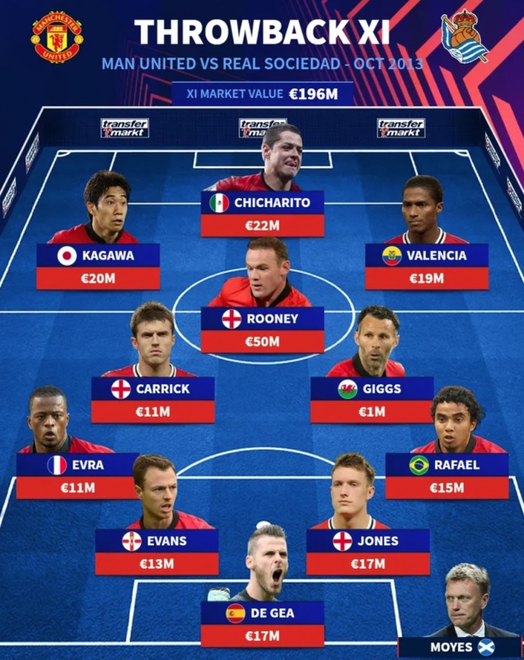 3月7日訊 曼聯(lián)在本輪歐聯(lián)杯對陣皇家社會,《轉(zhuǎn)會市場》也列出了曼聯(lián)在2013年10月隊史首次在歐戰(zhàn)和皇家社會交手時的首發(fā)陣容情況。