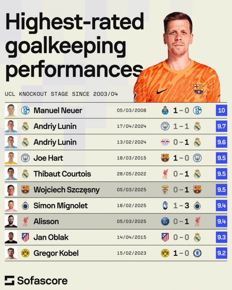 sofascore歐冠淘汰賽歷史門將評分榜:03-04賽季以來有統(tǒng)計