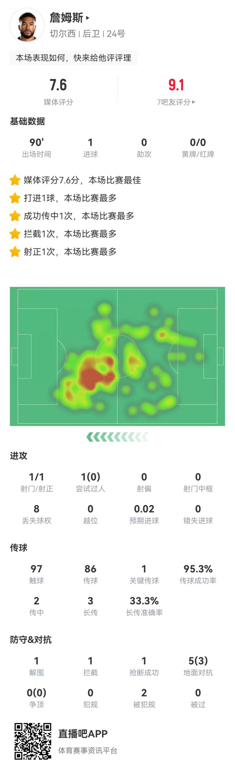 除特別注明外,本站所有內(nèi)容均為九球直播整理排版,轉(zhuǎn)載請注明出處:里斯-詹姆斯客串后腰數(shù)據(jù):1球+1關(guān)鍵傳球 5對抗3成功 7.6分最高