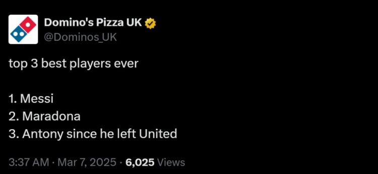 發(fā)布時間:2025年03月07日 04:50點擊:欄目:足球新聞 3月7日訊 歐聯(lián)杯1/8決賽首回合,貝蒂斯2-2戰(zhàn)平吉馬良斯。賽后,知名披薩連鎖品牌達美樂英國區(qū)官推盛贊安東尼。本場比賽,安東尼“蹭”到一次助攻,加盟貝蒂斯后8場直接參與6球。達美樂官推寫道:“有史以來最好的三名球員分別是:1、梅西,2、馬拉多納,3、離開曼聯(lián)后的安東尼?!?/p> 除特別注明外,本站所有內(nèi)容均為九球直播整理排版,轉(zhuǎn)載請注明出處:達美樂披薩吹圓神:歷史前三是梅西、馬拉多納、離開曼聯(lián)的安東尼 本文標簽: 足球 梅西 英超 曼聯(lián) 西甲 皇家貝蒂斯