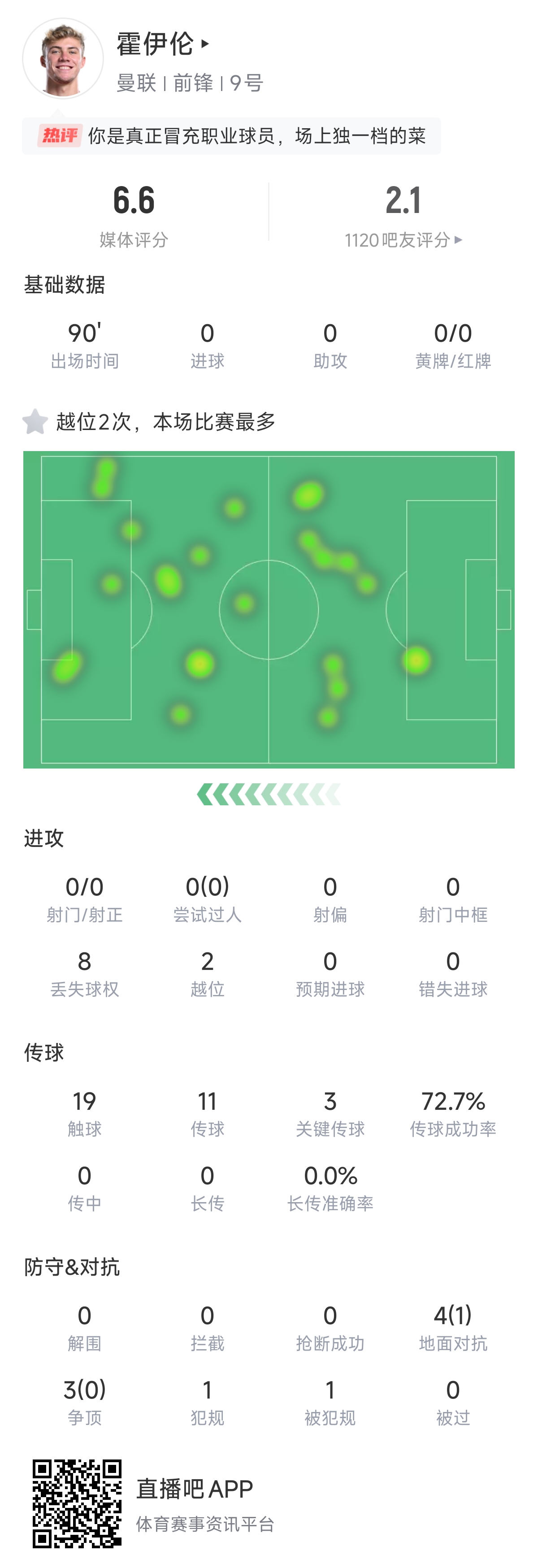 22歲的霍伊倫本賽季在歐聯(lián)杯有5球入賬,數(shù)據(jù)還算不錯(cuò)。但是賽季總數(shù)據(jù)36場(chǎng)7球1助實(shí)在對(duì)不起他6000萬(wàn)歐的身價(jià)。本場(chǎng)比賽霍伊倫打滿(mǎn)全場(chǎng),熱點(diǎn)圖也遍布全場(chǎng),有3次關(guān)鍵傳球,可惜沒(méi)有射門(mén),也沒(méi)有過(guò)人。此外,2次越位和7次對(duì)抗1成功的數(shù)據(jù)也略顯尷尬。