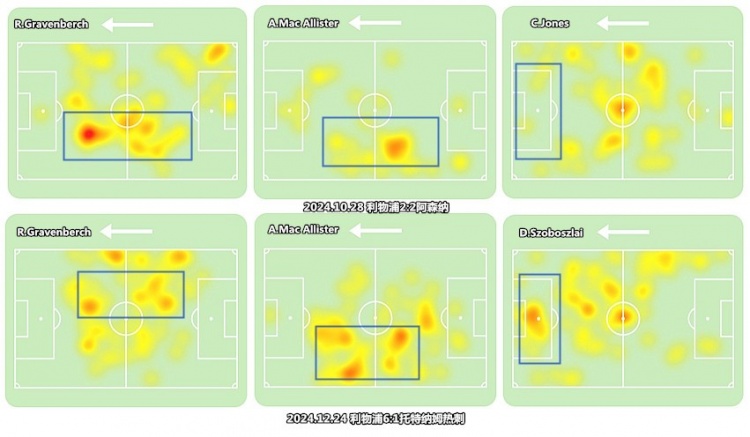 斯洛特會根據(jù)比賽需要,調(diào)整赫拉芬貝赫和麥卡利斯特的位置,兩人或平行站位,或前后呼應(yīng),不變的是索博斯洛伊始終要靠近中鋒,瓊斯出場時也會扮演“影鋒”。