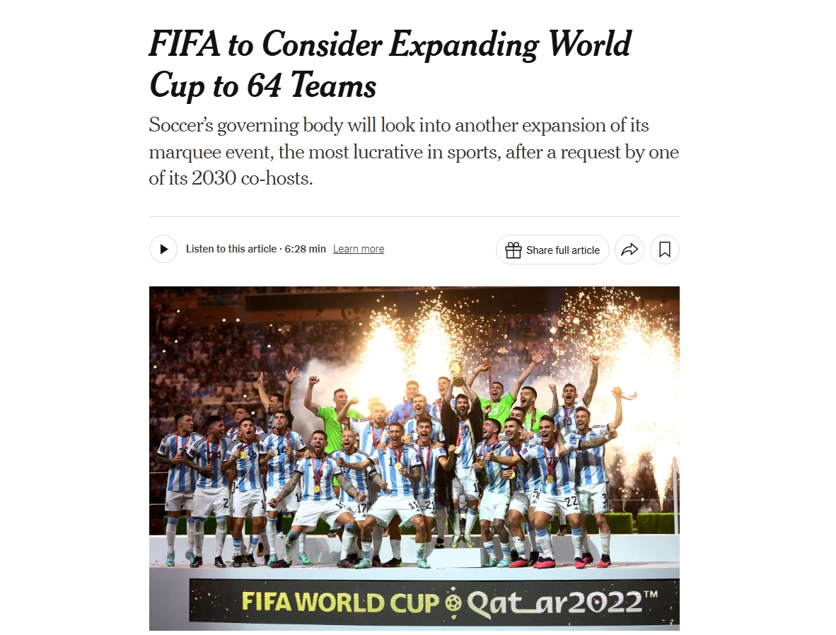 03月07日訊 《紐約時報》昨日透露,國際足聯(lián)正在考慮將2030世界杯的參賽隊伍擴(kuò)充至64支,以紀(jì)念賽事一百周年。據(jù)悉,這一提議換來了與會各方“震驚的沉默”。
