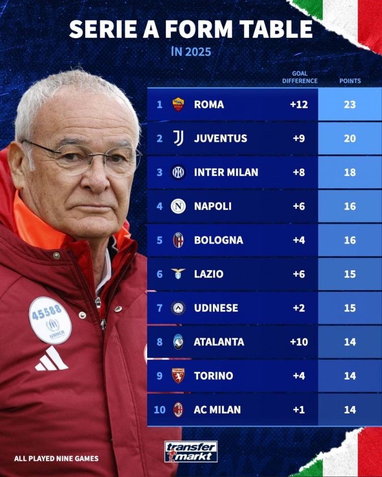 除特別注明外,本站所有內(nèi)容均為九球直播整理排版,轉(zhuǎn)載請(qǐng)注明出處:只手補(bǔ)天!2025意甲積分榜:羅馬23分居首,尤文20分、國(guó)米18分