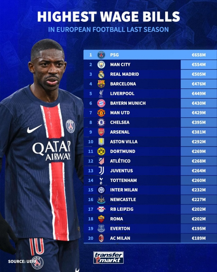 3月7日訊 歐足聯(lián)不久前公布了各俱樂部上賽季薪資情況,《轉(zhuǎn)會(huì)市場(chǎng)》也就此列出了榜單,巴黎居首。