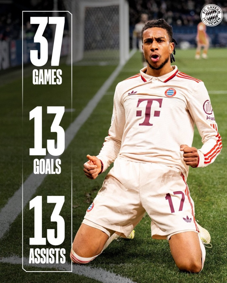 數(shù)據(jù)統(tǒng)計顯示,23歲的法國邊鋒在去年夏天5300萬歐元從水晶宮轉(zhuǎn)會拜仁,本賽季各項賽事為拜仁出戰(zhàn)37場,貢獻13球13助攻。