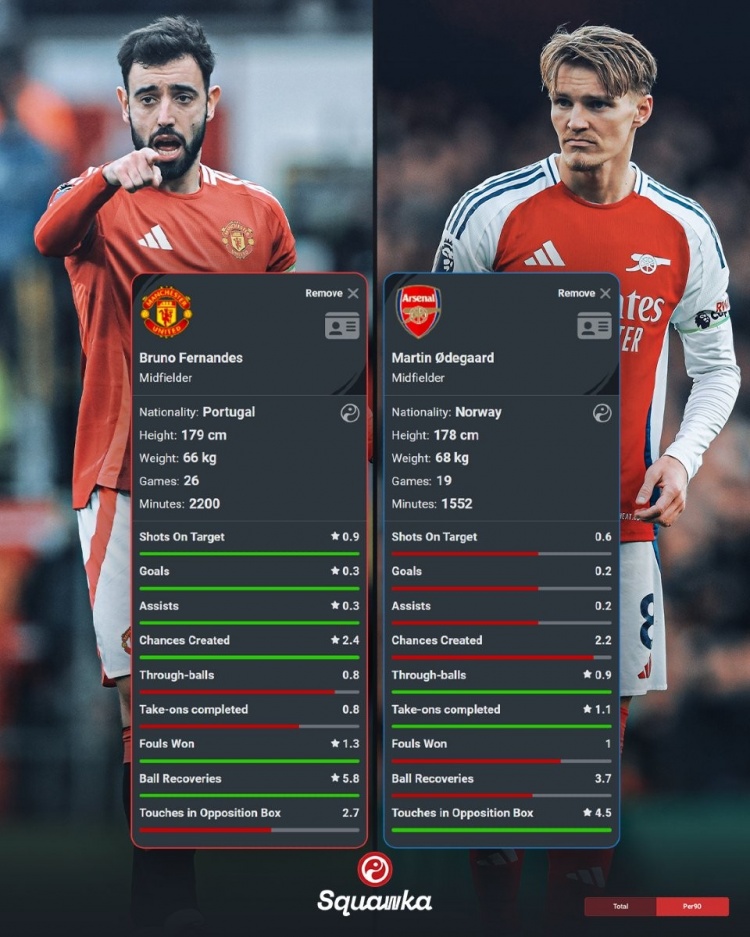 3月8日訊 曼聯(lián)將在本輪英超迎戰(zhàn)阿森納,數(shù)據(jù)機(jī)構(gòu)squakwa也對比了兩隊(duì)核心的本賽季英超每90分鐘關(guān)鍵數(shù)據(jù),B費(fèi)在多項(xiàng)數(shù)據(jù)領(lǐng)先。