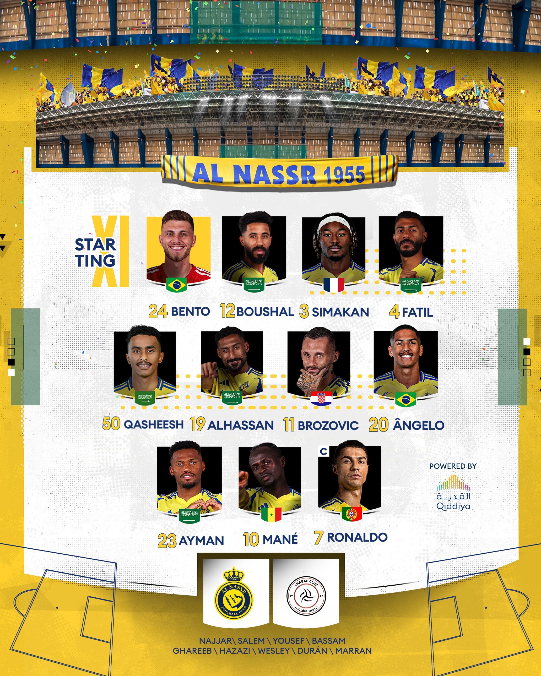 利雅得勝利替補:36-納賈爾、9-杜蘭、16-馬蘭、29-加里卜、40-阿爾塔漢、58-哈扎齊、80-韋斯利-特謝拉、83-納吉迪、88-哈扎齊
