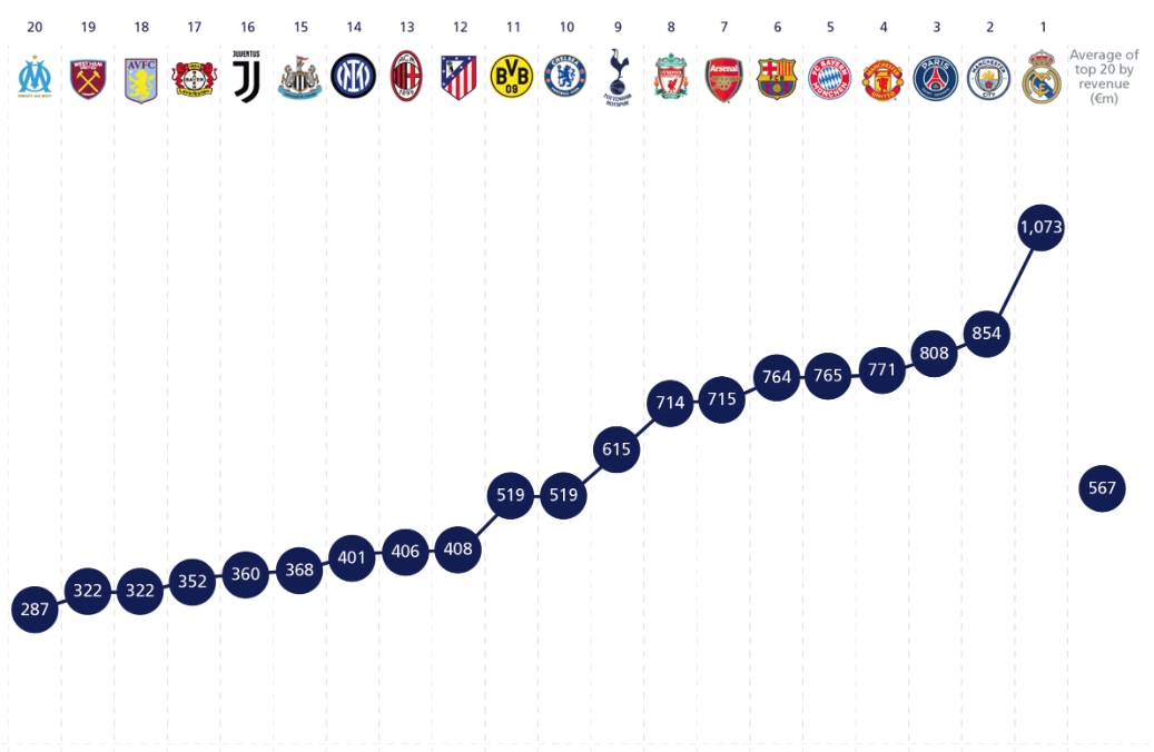 2024歐洲俱樂部總收入排行前20(單位:歐元):