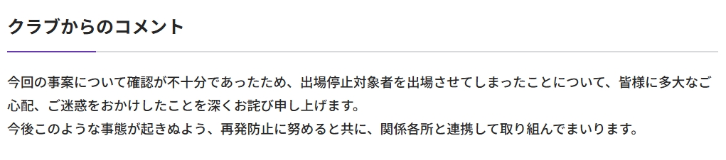 廣島三箭俱樂部官方寫道:“由于我們對(duì)此事件調(diào)查不充分,導(dǎo)致被禁賽的球員仍然參賽,給大家?guī)砹藫?dān)憂與不便,我們深表歉意。