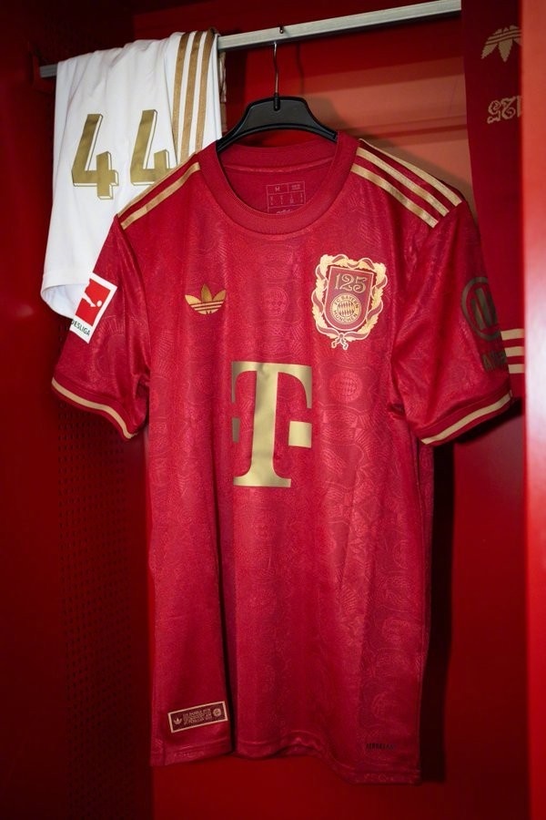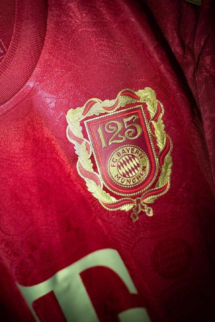 這款獨特的特別版球衣延續(xù)了傳統(tǒng)的紅色,并配以金色的品牌標志。此外所設(shè)計的紀念徽章則融入了成立文件中的元素、盾形紋章以及巴伐利亞的月桂花環(huán)元素,金色的細節(jié)則為設(shè)計增添了現(xiàn)代感。