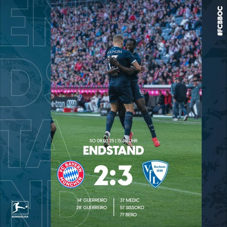 不同之處在于,此前三次拜仁都不是德甲領(lǐng)頭羊,而此次波鴻排名僅倒數(shù)第二。