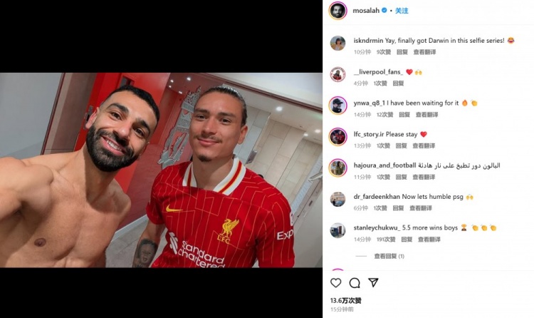 薩拉赫在本賽季比賽后通常都會曬出自己和進球隊友的合照,球迷們也調(diào)侃道:“終于輪到努涅斯了?!?/p>