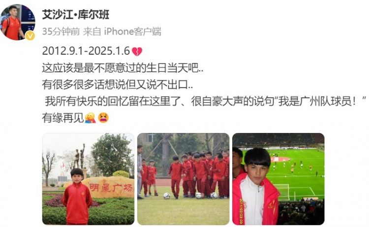 艾沙江-庫爾班在社媒寫道:“2012.9.1-2025.1.6。這應(yīng)該是最不愿意過的生日當(dāng)天吧,有很多很多話想說,但又說不出口,我所有快樂的回憶留在這里了,很自豪大聲的說句:‘我是廣州隊(duì)球員!’有緣再見?!?/p>