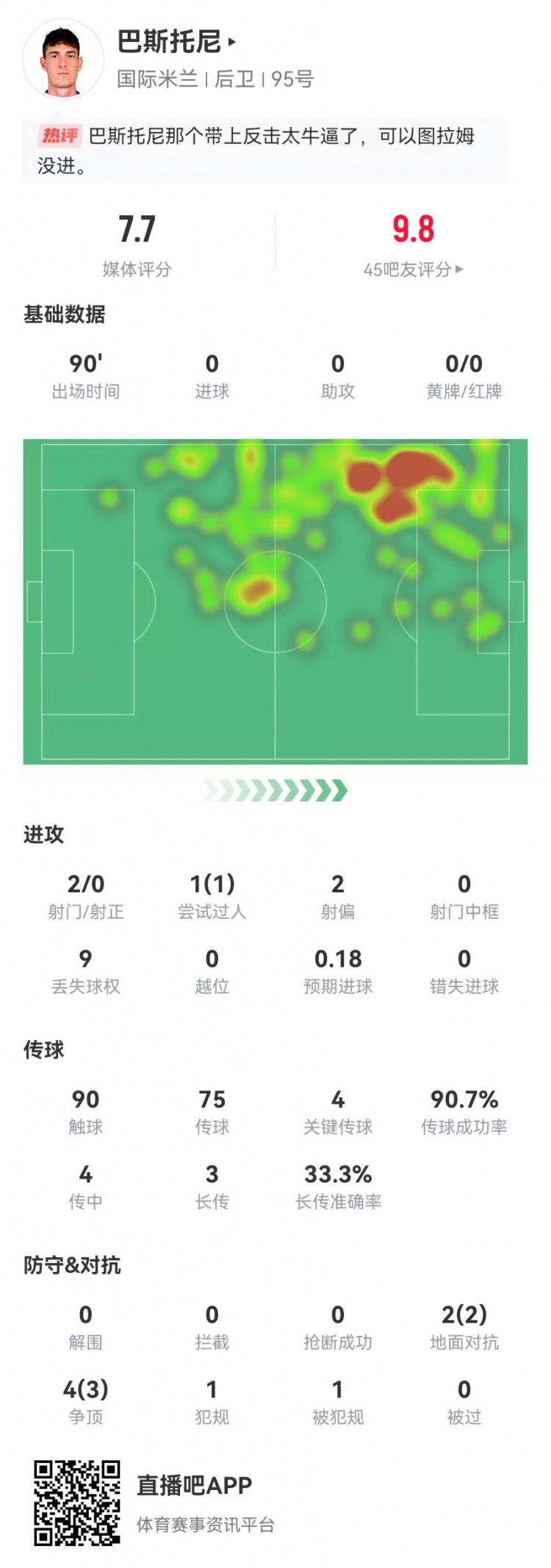 發(fā)布時間:2025年03月09日 06:50點擊:欄目:足球新聞 3月9日訊 國米在本輪意甲3-2逆轉蒙扎,巴斯托尼本場數據如下:首發(fā)踢滿全場預期進球0.18預期助攻0.3490觸球75傳球、68成功,成功率91%4關鍵傳球4傳中、2成功3長傳、1成功2射門、0射正1過人、1成功6對抗、5成功9丟失球權1犯規(guī)1造犯規(guī)獲評7.7分 除特別注明外,本站所有內容均為九球直播整理排版,轉載請注明出處:巴斯托尼客串左翼衛(wèi)數據:4關鍵傳球+2射門 6對抗5成功 獲評7.7分 本文標簽: 足球 意甲 國際米蘭 蒙扎