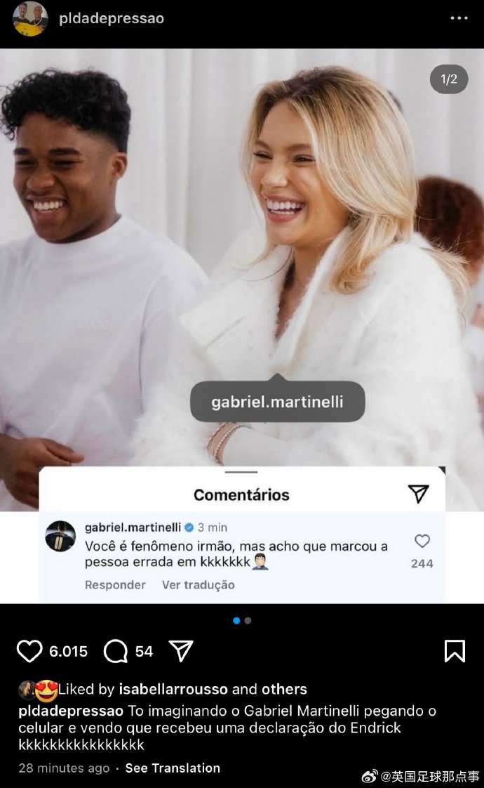 除特別注明外,本站所有內容均為九球直播整理排版,轉載請注明出處:【不小心】恩德里克在社媒曬妻子,卻標注成了阿森納的馬丁內利