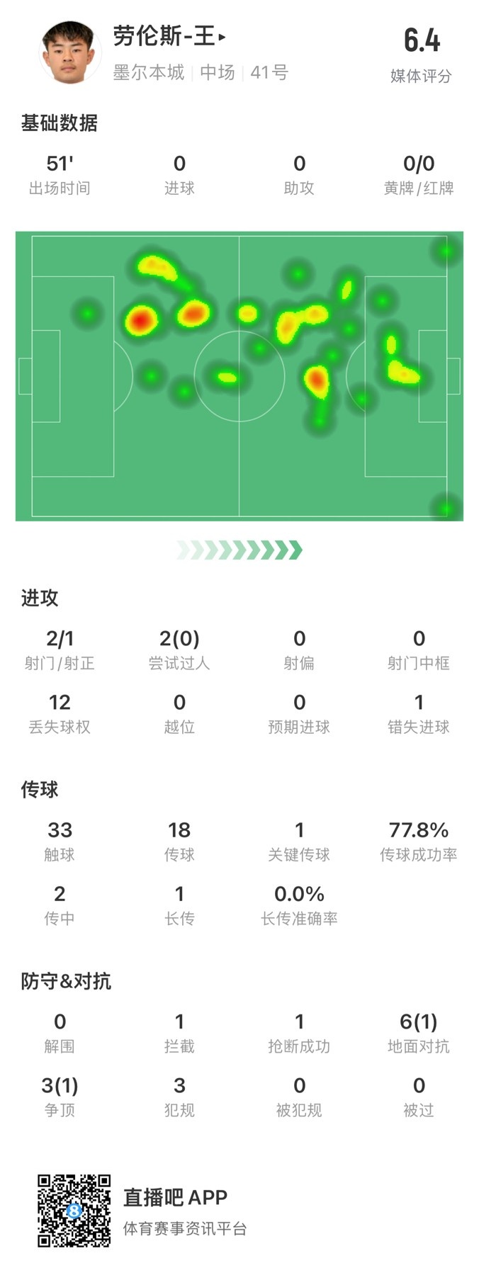 1月7日訊 本輪澳超,效力于墨爾本城的華裔球員黃振文迎來(lái)澳超首秀,他出戰(zhàn)51分鐘,獲評(píng)6.4分。