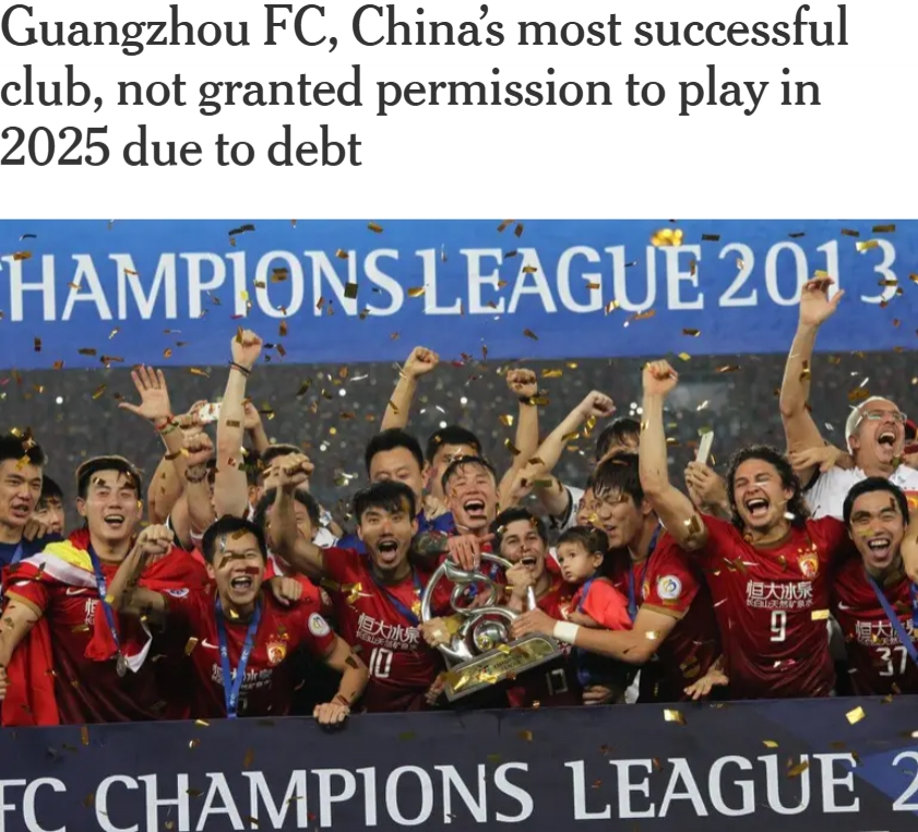 TA報道稱:廣州隊作為中國最成功的足球俱樂部,卻因為財務(wù)問題未獲準參加2025賽季職業(yè)聯(lián)賽。這家八屆中超冠軍球隊表示,他們無力償還債務(wù),因此無法符合中國足協(xié)的參賽要求。
