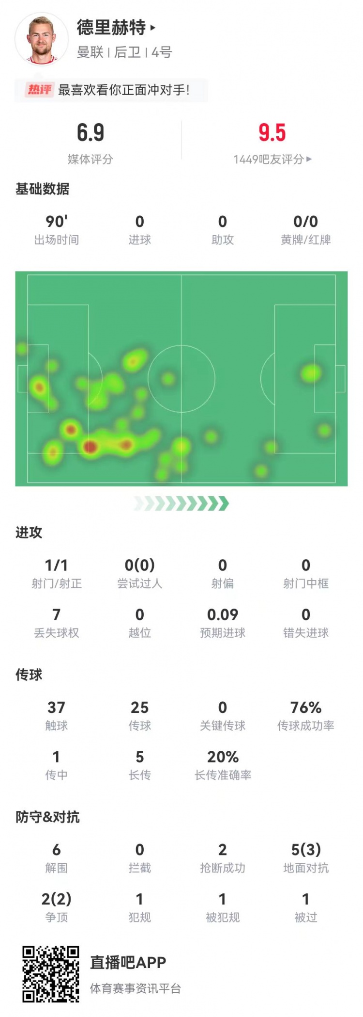 3月10日訊 曼聯(lián)在本輪英超1-1戰(zhàn)平阿森納,德里赫特本場(chǎng)數(shù)據(jù)如下: