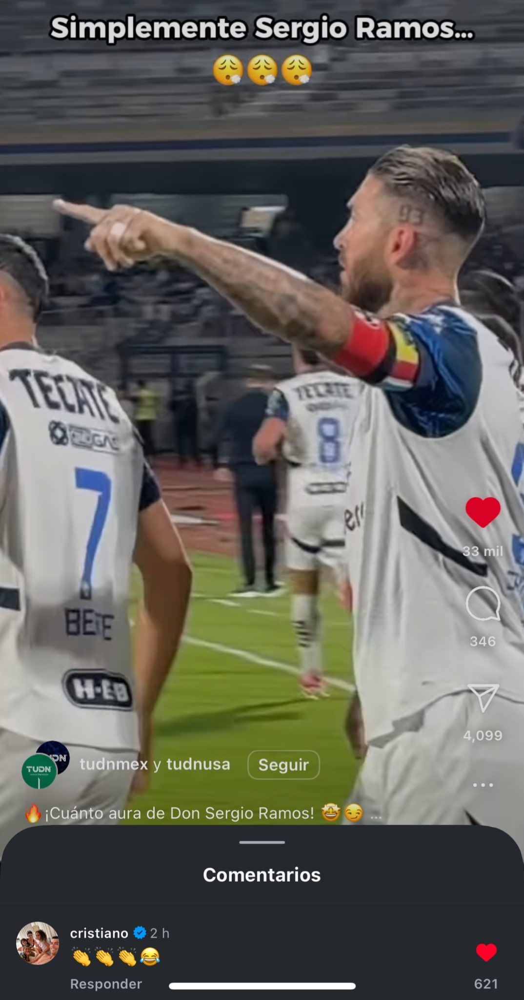 賽后,老隊(duì)友C羅在拉莫斯進(jìn)球的社媒留下三個(gè)鼓掌和一個(gè)笑哭