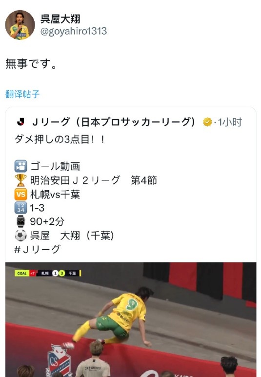 札幌主場(chǎng)為札幌穹頂體育場(chǎng),與普通球場(chǎng)不同,球門(mén)后面的廣告牌距離地面有2.8米高,吳屋大翔就從高處掉到了水泥地面上,當(dāng)時(shí)取得進(jìn)球的他想要翻越廣告牌和球迷們一起慶祝。