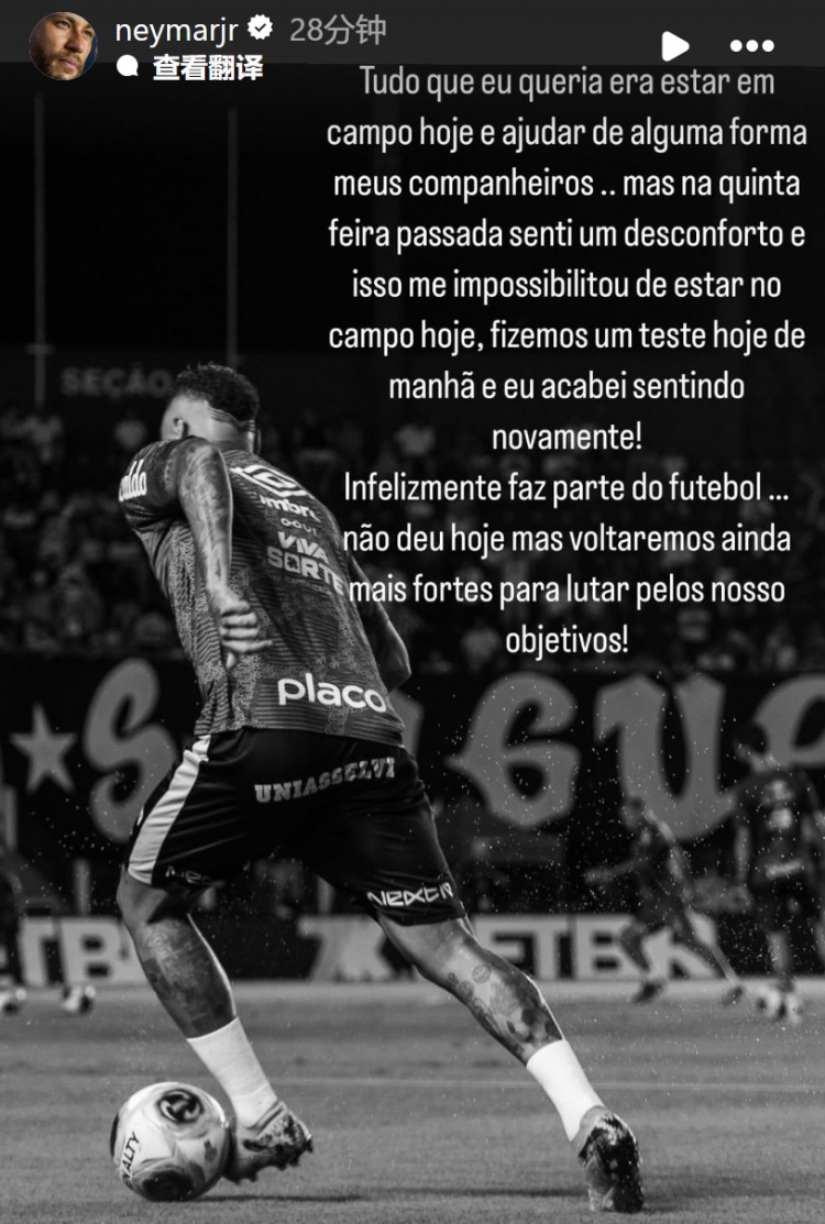 3月10日訊 今天,桑托斯在巴西錦標(biāo)半決賽的比賽中1-2不敵科林蒂安,內(nèi)馬爾在社媒發(fā)文說明了他未能登場的原因。