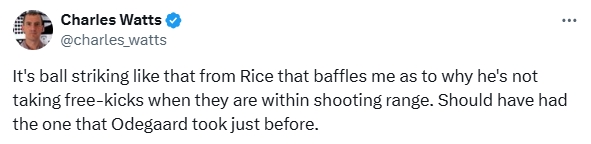 發(fā)布時間:2025年03月10日 11:50點擊:欄目:足球新聞 03月10日訊 英超第28輪,阿森納客場1-1戰(zhàn)平曼聯(lián)。比賽第74分鐘,賴斯用一腳漂亮的射門幫助阿森納扳平比分。在賴斯進球后,阿森納系的記者Charles Watts在社媒表示:“賴斯這樣的射門讓我困惑了,為什么獲得射程范圍以內(nèi)的任意球時不讓他去主罰呢?之前厄德高主罰的那個任意球應(yīng)該讓他去踢?!?/p> 除特別注明外,本站所有內(nèi)容均為九球直播整理排版,轉(zhuǎn)載請注明出處:記者:為什么任意球不讓賴斯主罰呢?厄德高那球應(yīng)該讓賴斯去踢的 本文標(biāo)簽: 足球 英超 阿森納 曼聯(lián)