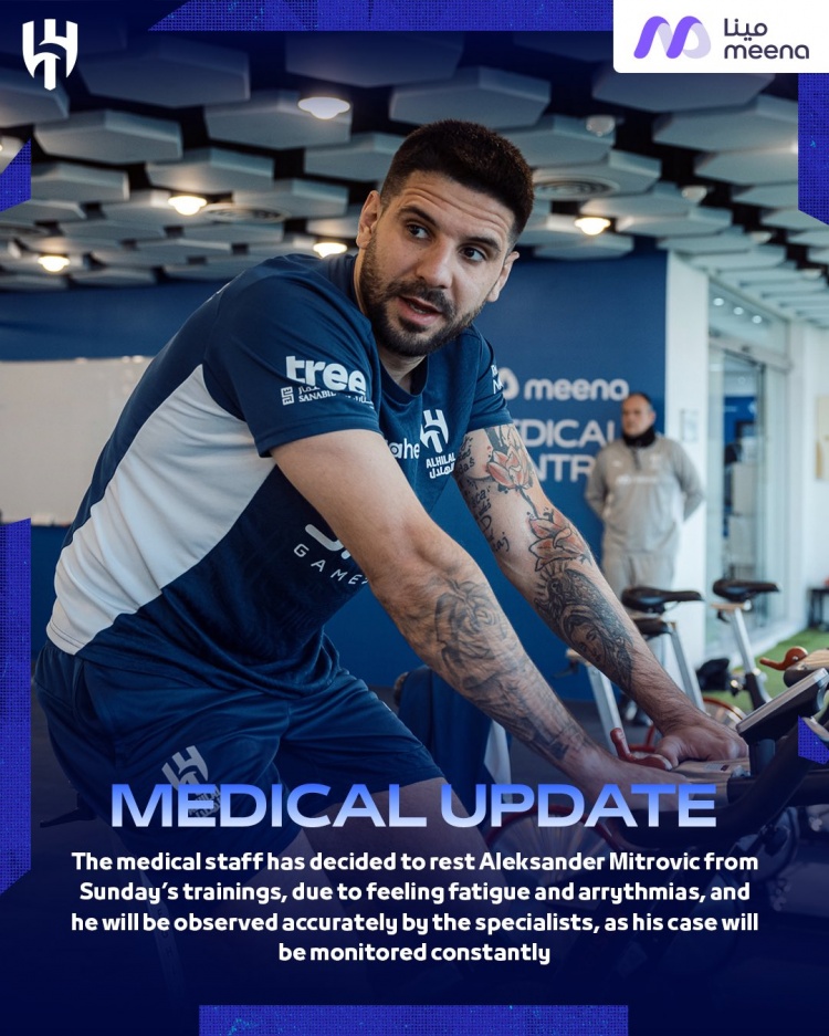 利雅得新月官方寫道:“由于感到疲勞和心律不齊,醫(yī)務(wù)人員決定讓米特洛維奇在周日的訓(xùn)練中休息,專家將對(duì)他進(jìn)行精確觀察,他的情況會(huì)得到持續(xù)檢測(cè)。”