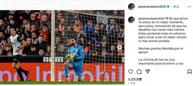 賽后瑪瑪達(dá)什維利更新社媒致歉,他寫道:“我清楚自己目前并不在最佳狀態(tài),但是困難會(huì)讓人變得更加堅(jiān)強(qiáng),接下來(lái)我會(huì)盡我所能拿出最佳水平。非常感謝梅斯塔利亞球迷們的支持!這場(chǎng)勝利非常重要,并且讓我們打起干勁繼續(xù)應(yīng)對(duì)之后的每一場(chǎng)比賽。繼續(xù)前進(jìn)!”