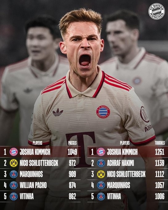 基米希領(lǐng)跑本賽季歐冠傳球與觸球統(tǒng)計榜