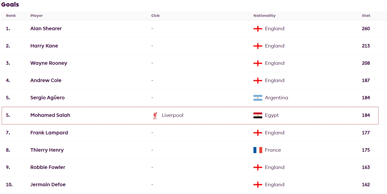 本賽季英超開始前,薩拉赫的英超歷史總進球數(shù)為157球,排在英超歷史總射手榜的第11位。而目前賽季還未結(jié)束,薩拉赫已經(jīng)沖到了英超歷史總射手榜的并列第5位,甚至還有望超越第4名的科爾!