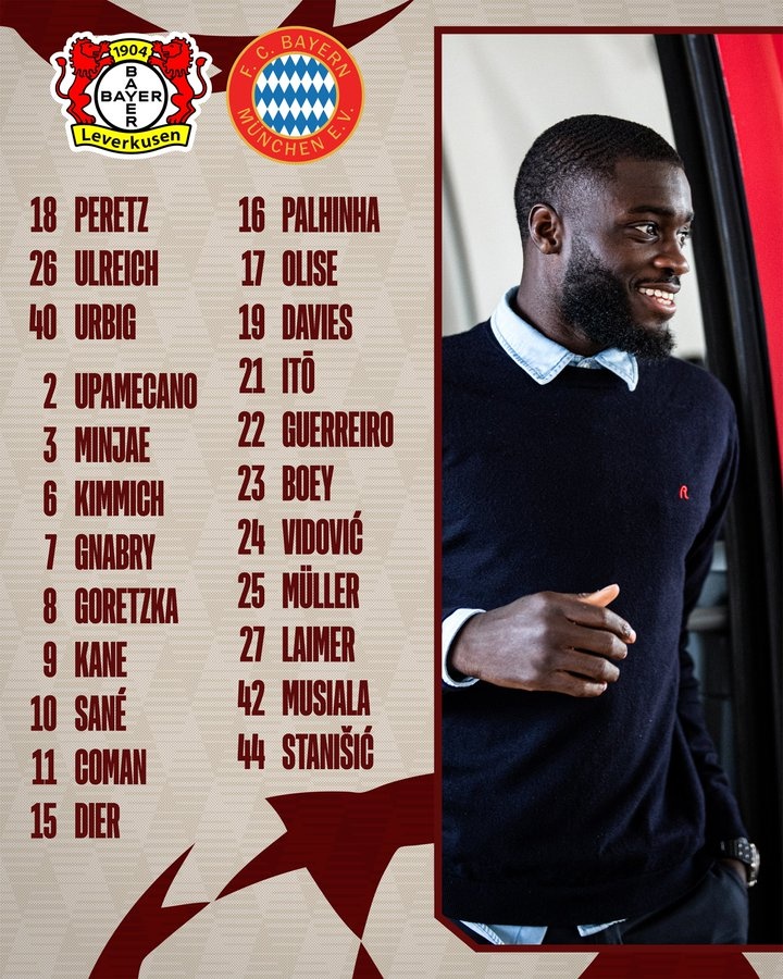 3月11日訊 北京時間3月12日周三凌晨4點,拜仁慕尼黑將在歐冠1/8決賽次回合客場挑戰(zhàn)勒沃庫森,首回合,拜仁在主場3-0獲勝。今天,拜仁公布了次回合大名單,名單如下: