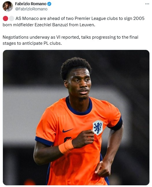 羅馬諾在社交媒體上這樣寫(xiě)道:“在簽約2005年出生的魯汶中場(chǎng)班祖齊的競(jìng)爭(zhēng)中,摩納哥領(lǐng)先于兩家英超俱樂(lè)部。就像VI報(bào)道的那樣,談判正在進(jìn)行中,并且已經(jīng)進(jìn)入到最后階段,以趕在英超俱樂(lè)部之前。”
