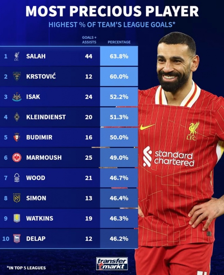 3月11日訊 《轉(zhuǎn)會市場》統(tǒng)計(jì)了本賽季五大聯(lián)賽直接參與進(jìn)球占全隊(duì)總進(jìn)球的比率情況,薩拉赫無懸念居首,已經(jīng)轉(zhuǎn)會曼城的馬爾穆什依然是法蘭克福隊(duì)內(nèi)最高。