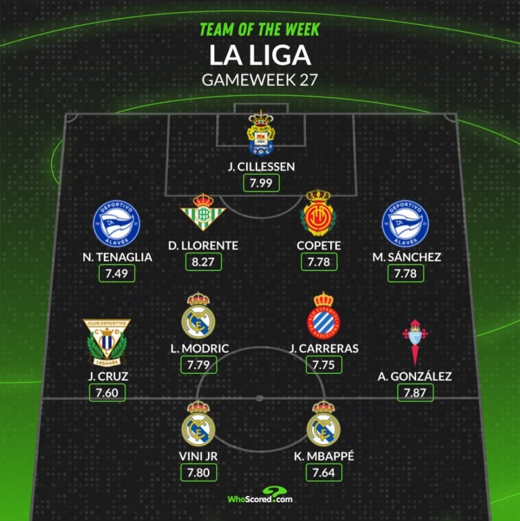 3月11日訊 西甲第27輪聯(lián)賽已經(jīng)完賽(巴薩vs奧薩蘇納延期),whoscored也列出了本輪評分最佳陣容,皇馬3將在列。