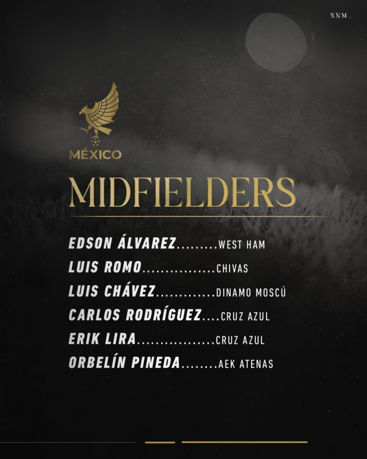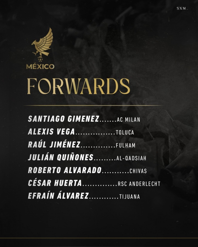 前鋒:圣地亞哥-希門尼斯(米蘭)、貝加(托盧卡)、勞爾-希門尼斯(富勒姆)、奎尼奧內(nèi)斯(卡迪西亞)、阿爾瓦拉多(瓜達(dá)拉哈拉)、韋爾塔(安德萊赫特)、埃弗林-阿爾瓦雷斯(蒂華納)