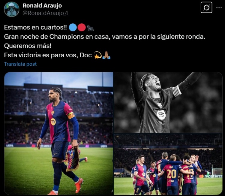 巴薩隊長阿勞霍也在賽后社媒曬照,將勝利獻給球隊已故隊醫(yī),配文寫道:“我們晉級8強,很棒的歐冠主場之夜,讓我們晉級下一輪!我們還想要更多。勝利獻給你,醫(yī)生。”