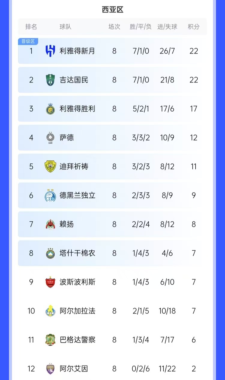 其中利雅得新月首回合0-1落敗但是次回合干脆利落4-0解決戰(zhàn)斗,利雅得勝利首回合0-0打平次回合同樣3-0輕松拿下,吉達(dá)國(guó)民則是兩回合直接雙殺對(duì)手晉級(jí)。此外這三隊(duì)也是聯(lián)賽階段西亞區(qū)的前三名,積分?jǐn)鄬宇I(lǐng)先。